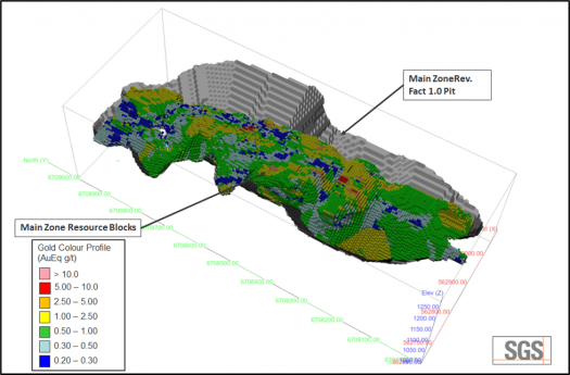 The estimation of gold grades into a block model was carried out with the inverse distance squared (ID2) interpolation method on uncapped composites with the resultant block model comprised of a block size of 5m (easting) x 5m (northing) x 5m (elevation). Specific gravity was estimated was based on 76 mineralized samples and 67 waste rock samples.