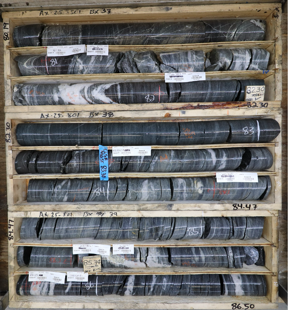 Figure 5: Diamond drill core from AX-25-801. discordant quartz veins with accessory Bi-sulphosalts, aresenopyrite, and visible gold (See Figure 2).
