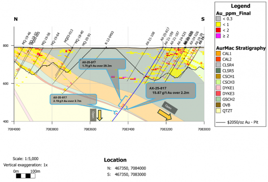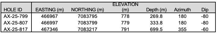 - AX-25-799 – 7.04 g/t Au over 6.0m within 0.68 g/t Au over 125.5m; including high-grade intervals of 29.30 g/t Au over 1.4m