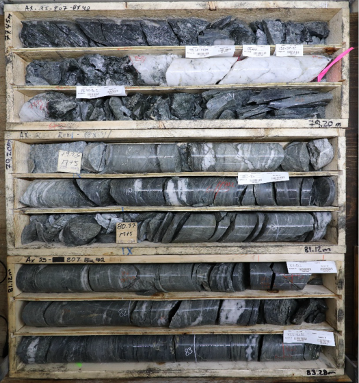 Figure 7: Strongly mineralized calc-silicate altered metasedimentary rocks in AX-25-807, typical of Airstrip Mineralization. High-grade intersections as above have the potential to convert waste blocks and extend mineralization at depth, potentially joining the conceptual pits of Airstrip and Powerline.