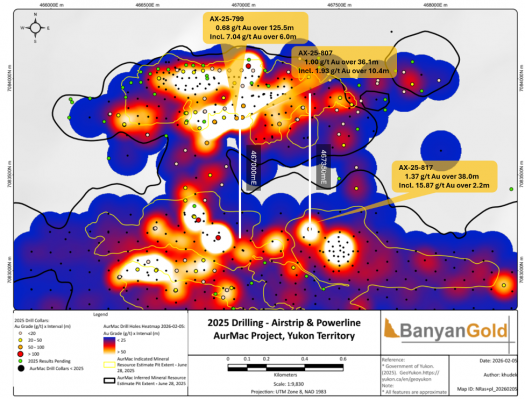 VANCOUVER, BC, February 8, 2026 - Banyan Gold Corp. (the "Company" or "Banyan") (TSX-V: BYN) (OTCQB: BYAGF) is pleased to announce it has intersected high-grade gold (“Au”) mineralization in the Airstrip Deposit (“Airstrip”) at approximately 350 metres (“m”) vertical depth, over 350 m down-dip of previous intersections at its AurMac Project (“AurMac”), Yukon, Canada.
