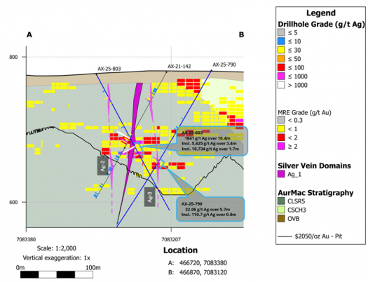 Figure 2: Cross-section A-B in Powerline. Silver intersections within drillholes AX-25-803 are consistent with late brittle feature for the Ag-1 vein intersected in drillhole AX-21-142 (see news release dated October 29, 2025). Two sub-parallel veins have been identified adjacent to the Ag-1 vein intersected in holes AX-21-142 and AX-25-803; Ag-2 and Ag-3 are north and south of Ag-1 respectively (magenta veins and dashed traces above).