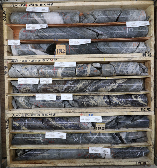 - AX-25-803 was drilled 90m away from 2021’s hole AX-21-142 and intersected the vein 20m from hole 142 at a depth of 115m.