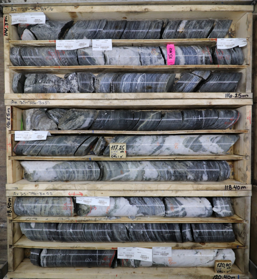 Figure 4: High-grade gold mineralization in AX-25-802 is associated with zones of marl with associated brecciated quartz veins.