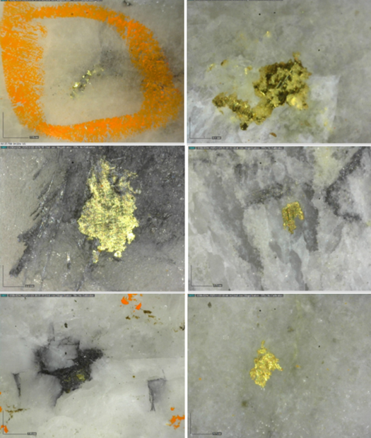 Figure 2: Visible gold intersections in drillholes from Central Powerline. Top left - AX-25-798 – 94.0m. Top Right – AX-25-805 – 154.3m. Middle Left – AX-25-822 – 106.2m. Middle Right – AX-25-816 – 90.0m. Bottom Left - AX-25-810 – 184.3m. Bottom Right - AX-25-823 – 86.7m. While visible gold at Powerline is typically (but not always) indicative high-grade intervals, the potential for heterogeneous distribution of gold in a recovered drill core and analyte material that is processed by the laboratory, means not all instances of visible gold will be reflected in high-grade assay results.