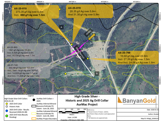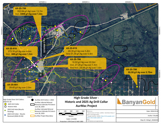 VANCOUVER, BC, March 16, 2026 - Banyan Gold Corp. (the "Company" or "Banyan") (TSX-V: BYN) (OTCQB: BYAGF) is pleased to announce it has intersected several new, distinct high-grade silver (“Ag”) veins at its AurMac Project (“AurMac”), Yukon, Canada.