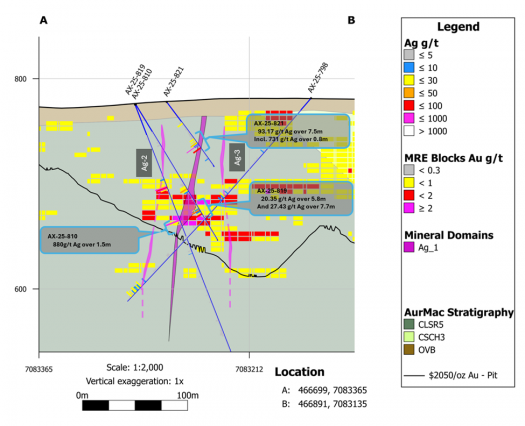 Figure 3: Cross-section A-B in Powerline. Silver intersections within drillholes AX-25-810, -819, and -821 are consistent with late brittle feature for the AG-1 vein intersected in drillhole AX-21-142 and AX-25-803 (see news releases dated October 29, 2025 and January 22, 2026). Two sub-parallel veins have been identified adjacent to the AG-1 vein intersected in holes AX-21-142 and AX-25-803; AG-2 and AG-3 are north and south of AG-1, respectively (magenta veins and dashed traces above). Block model for Au MRE included to highlight cross-cutting nature of silver mineralization.