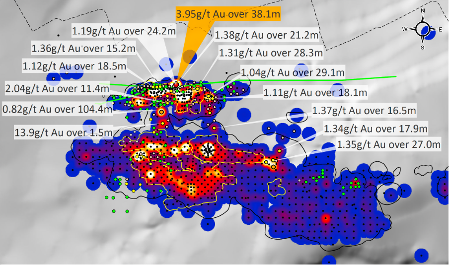 Highlights included broad zones of near-surface gold mineralization with higher-grade cores, such as: