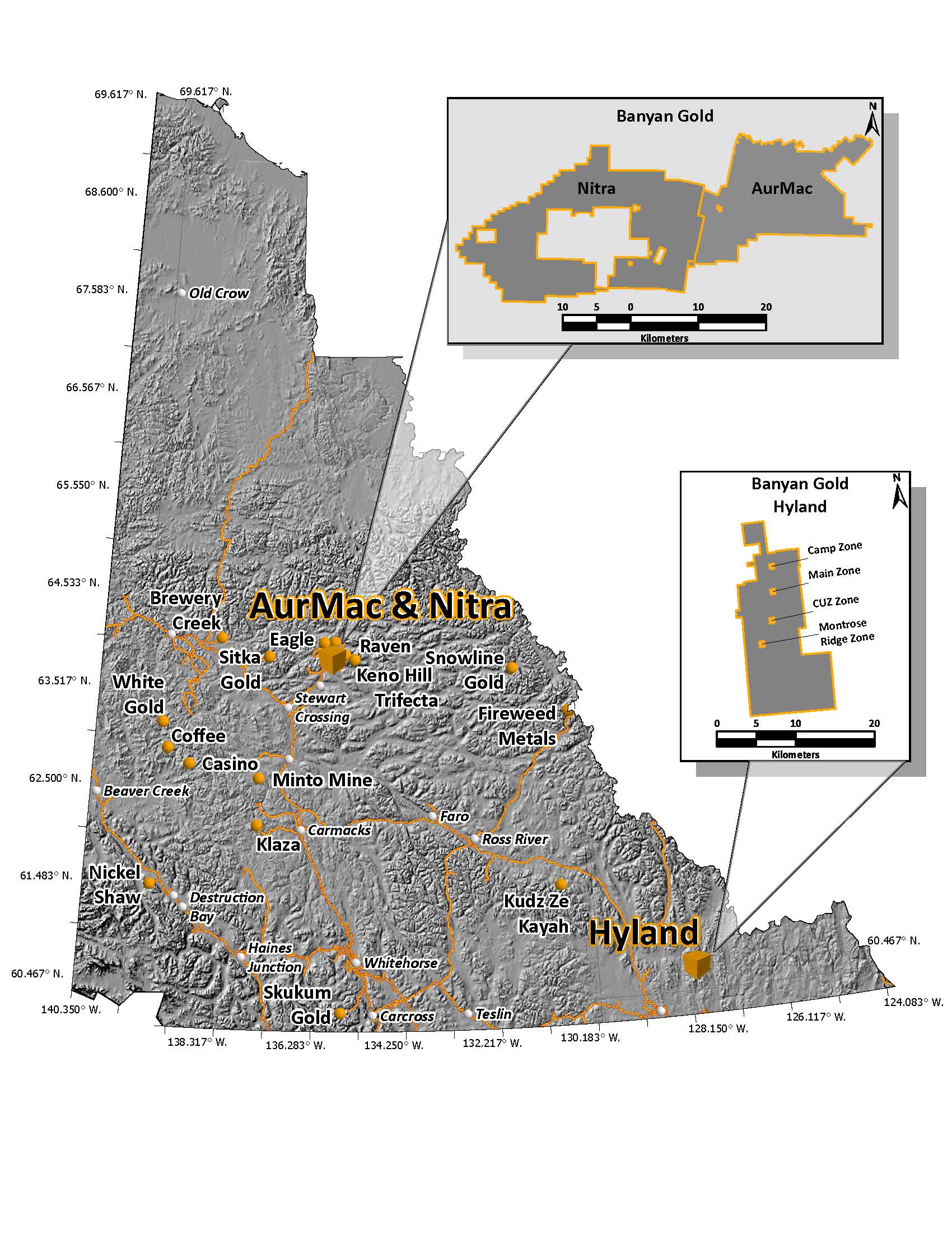 The AurMac Gold Project (the “Project” or the “Property”) is located in the Mayo Mining district, approximately 40 kilometres (“km”) northeast from the village of Mayo and 356 km north of Whitehorse, within the traditional territory of the First Nation of Na-Cho Nyak Dun. The AurMac Gold Project consists of the Aurex and McQuesten projects optioned from Victoria Gold Corp. and Hecla Mining Company, respectively, as well as additional claims staked by Banyan Gold Corp. (the “Company” or “Banyan”). With the optioned claim blocks and additional staking completed by Banyan, the AurMac Property currently covers over 291 km2. Banyan has earned 100% of the Aurex and McQuesten Properties subject to royalties (refer to news release dated September 18, 2025). The projects are road accessible through the Silver Trail highway and a network of four-wheel drive roads and trails.