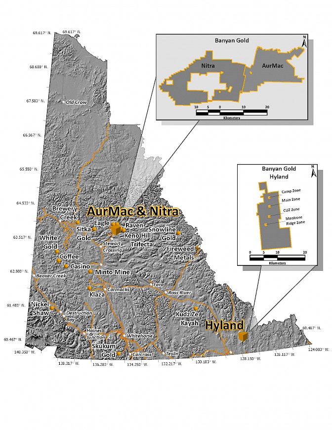 The 100% owned, subject to certain royalties, Hyland Gold Project (the “Project” or the “Property”) is located in the Watson Lake Mining District in southeast Yukon, approximately 74 kilometres northeast from the town of Watson Lake within the traditional territory of the Liard First Nation, part of the Kaska Nations. The Project consists of 927 active Yukon registered quartz mineral claims totalling over 18,620 hectares in area that is currently accessible by vehicles on a winter road from Watson Lake.