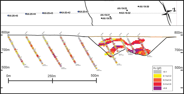 - 0.47 g/t Au over 30.5 metres from 43.0 metres in AX-20-41