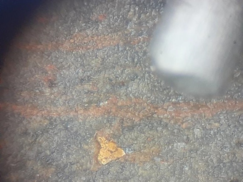 Photo 1: Visible gold from Hole MQ-20-81 from section 18.29m to 19.81m (1.52m) 27.7g/t Au proximal to a discordant quartz vein in a non-calcareous horizon 140 m stratigraphically above the “main” Airstrip Zone calcareous host rock. The grey object in top right corner is a 0.7mm wide graphite pencil for scale.