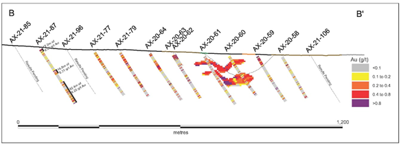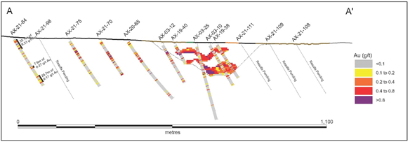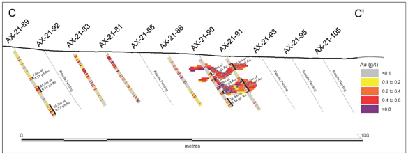 - 0.47 g/t Au over 26.4 metres from 25.9 m in AX-21-91