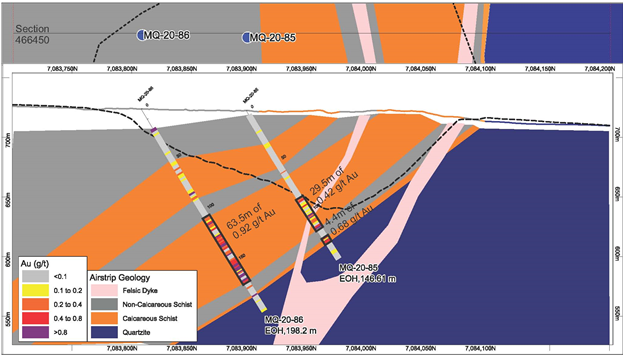 Drill holes MQ-20-85 to MQ-20-89 were located in West Airstrip to follow-up on the promising results of MQ-20-66 and MQ-20-67; where noteworthy grade-width gold mineralization was encountered in Phase 1 2020 drilling (news release September 21, 2020). Consistent with the geological model, the target calcareous schist unit showed significant quartz-calcite-pyrrhotite alteration, a key indicator for gold mineralization at Airstrip. Importantly, 2020 drill results have extended the strike length of the mineral zone by approximately 300 m to the West and also down dip within the conceptual pit limits used to constrain the 2020 Airstrip mineral resource estimation. Further definition of the western strike extent of the Airstrip Deposit will be a high priority for 2021 exploration efforts as the Deposit remains open to the West where a higher-grade trend is interpreted to exist.