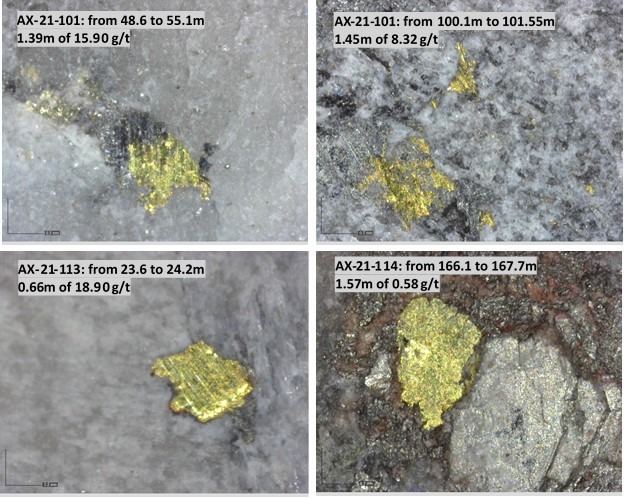 - 28.2 metres of 1.28 g/t Au from 8.8 m in DDH AX-21-113